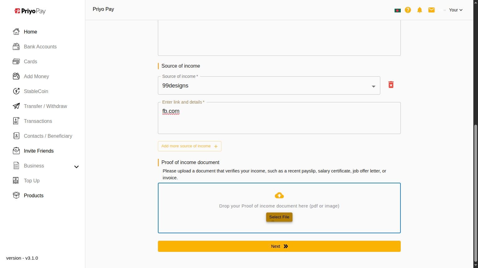 23\. Upload "Proof of income document" & Click "Next"\