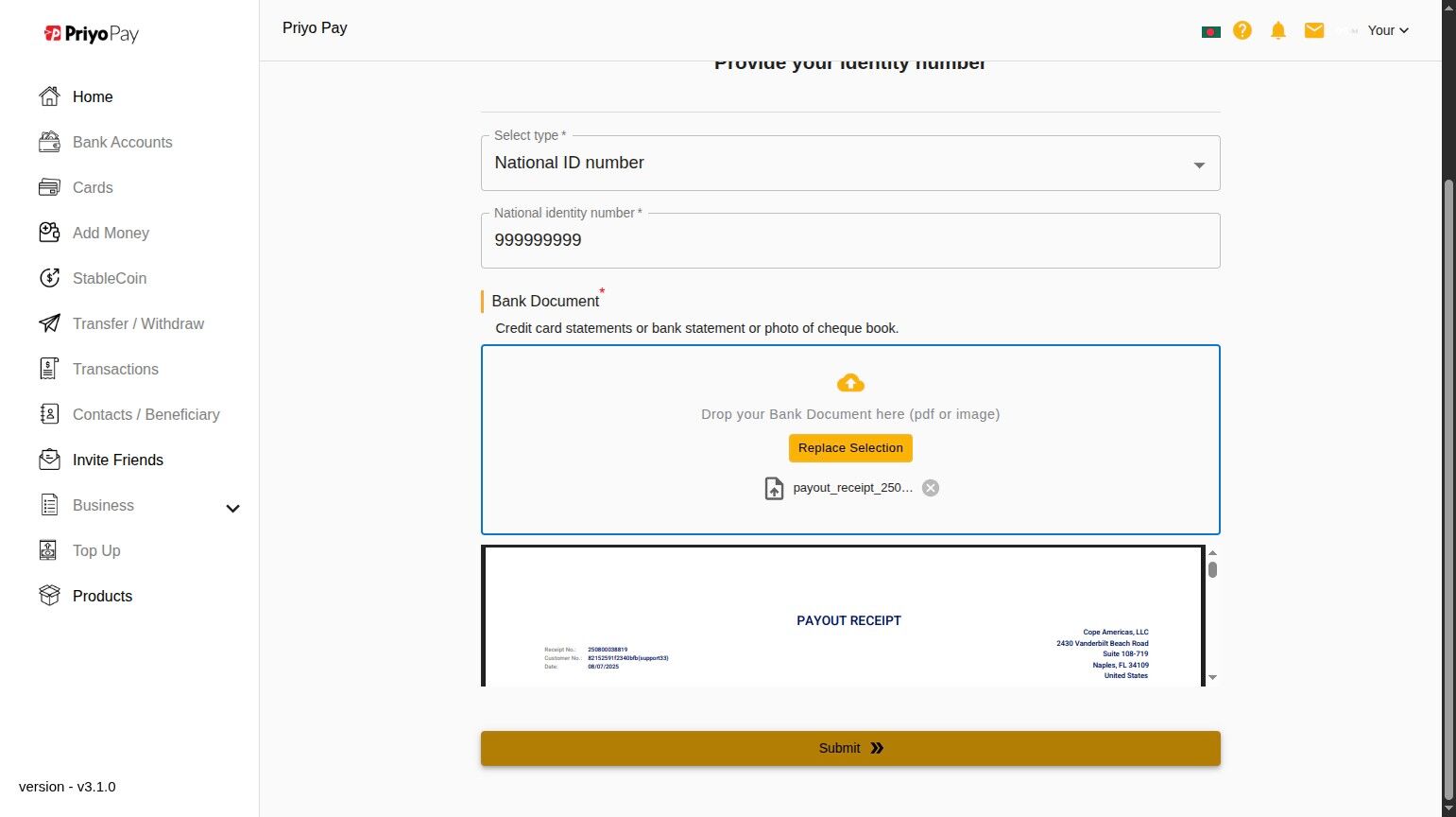25\. Upload "Bank Document" & Click "Submit"